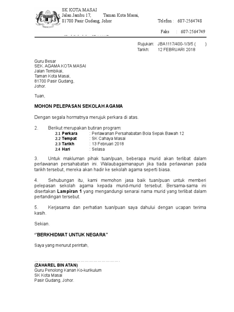 Dengan segala hormatnya perkara di. 5 Tidak perlu tulis berjela-jelas. Anakjagaan saya tidak dapat hadir ke sekolah pada tarikh tersebut kerana.